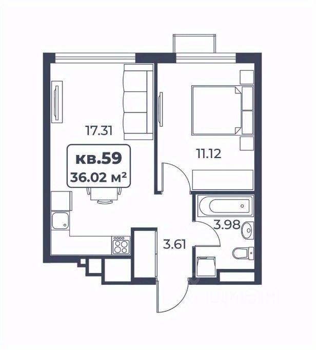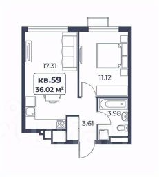 В строящемся ЖК продается 1-но комнатная квартира, которая состоит из кухни-гостиной 17,31 кв.м., спальни 11,12 кв. м., санузла 3,98 кв.м. и прихожей 3,61 кв. м. Общая площадь квартиры 36,02 кв.м. Расположена на 1 этаже 8-ми этажного дома.