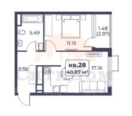 В строящемся ЖК продается 1-но комнатная квартира, которая состоит из спальни 11,15 кв.м., кухни-гостиной 17,16 кв. м., санузла 5,49 кв.м., прихожей 5,59 кв.м. и балкона 1,48 кв. м. Общая площадь квартиры 40,87 кв.м. Расположена на 4 этаже 8-ми этажного дома.