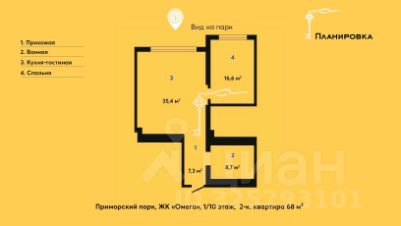 Квартира общей площадью 68 м², располагается на 1 этаже 10-этажного жилого комплекса Омега.