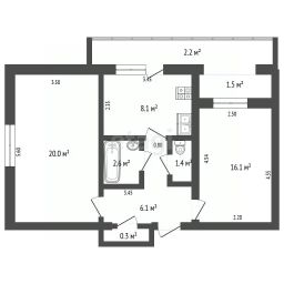 - Просторная и светлая: кухня 9 м², комнаты 20 и 14 м².
