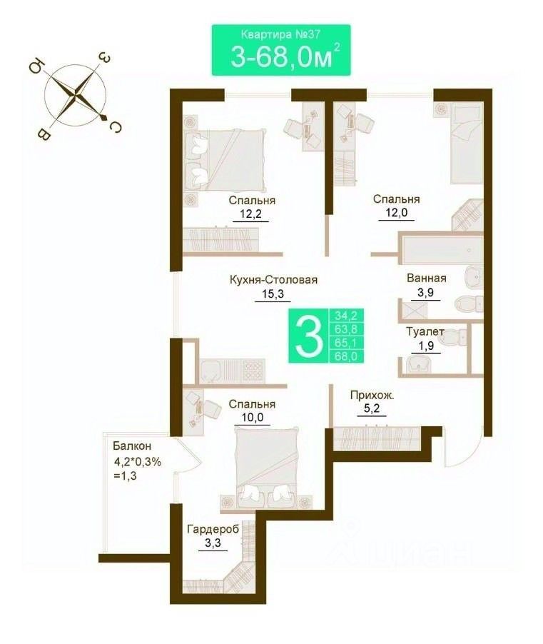 В строящемся ЖК "Солнечный парк" (пгт. Молодежное, Симферопольский район) продается отличная квартира, которая состоит из кухни-гостиной 15,3 м2, трех комнат 12,2, 12,0 и 10,0 м2, раздельного санузла 3,9 и 1,9 м2, прихожей 5,2 м2 и балкона. Общая площадь 65,1 м2.