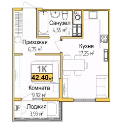 1-комн. квартира с предчистовой отделкой в ЖМ "Город Мира" на 8 этаже. Общая площадь: 40.44 кв.м., жилая: 9.92 кв.м., площадь просторной кухни-столовой: 17.25 кв.м. Все окна выходят на одну сторону. В квартире один балкон, один совмещенный санузел. Высота потолков 2.7 м.