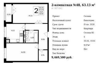 Цены от застройщика Ипотека в банках: Сбер, ВТБ, Банк Россия, Генбанк. Вид квартиры во двор + улицу. Рассрочка-ПВ от 30% и остаток равными платежами без переплат до декабря 2027 года. При 100 % оплате или ипотеке предоставляется скидка 3%. В домах 3 и 4 — квартиры сдаются с отделкой White box. В доме 1 и 2 — квартиры с черновой отделкой, перегородки выполнены в один камень. В продаже лоты на выбор от 35.28 - 80.39 м2 В продаже квартиры с предчистовой отделкой White Box вам остается только внести финальные штрихи по своему вкусу. В доме 1,2 квартиры сдаются в черновой отделке. В домах 3 и 4 все квартиры будут сдаваться с отделкой White box. Жилой комплекс "Сезоны" в солнечной Евпатории В Евпатории солнце светит 258 дней в году! В городе у моря каждый день особенный! Лето приносит свежесть морского бриза, осень мягкость теплых тонов, зима уют домашнего очага, а весна пробуждение природы. В жилом комплексе "Сезоны" вы найдете свой идеальный уголок для жизни в любое время года! Евпатория город, где солнце живёт круглый год Этот живописный курорт в Крыму на берегу Каламитского залива славится уникальным климатом и целебной природой. С одной стороны город омывают воды Мойнакского озера с уникальными лечебными грязями, с другой розовое соленое озеро Сасык-Сиваш, известное своими оздоровительными свойствами. Современный жилой комплекс для жизни с комфортом "Сезоны" это 12 домов переменной этажности, где всё продумано до мелочей. На территории будет построен современный двухэтажный торговый центр, всё необходимое в шаговой доступности. Первый этап строительства включает четыре дома с секциями на 7, 8 и 9 этажей. Расположение комплекса в перспективном районе Евпатории, неподалёку от проспекта Победы. Удобные подъездные пути и транспортная доступность делают локацию особенно привлекательной. Евпатория город, где история встречается с современностью Прогуляйтесь по уютным улицам, любуясь памятниками архитектуры, фонтанами и ротондами. Побывайте в парках и музеях, откройте для себя древнюю историю города. А море, солнце, фрукты и развлечения сделают каждый ваш день незабываемым! Жилой комплекс "Сезоны" дарит вдохновение и комфорт круглый год. Безусловные преимущества -приватные дворы без машин -индивидуальное отопление -дизайнерские холлы -просторные бесшумные лифты -ландшафтное озеленение с автополивом -современные детские игровые площадки -пространства для отдыха всей семьи -удобные парковочные места и колясочные -кладовые для сезонных вещей -полная безбарьерная среда Выбор планировок для любых потребностей: -уютные однокомнатные от 31 до 46 м² -функциональные двухкомнатные от 57 до 62 м² -просторные трёхкомнатные квартиры 80 м² -Все квартиры имеют остекленные лоджии. Локация в центре возможностей: -Центральная городская набережная 6 км -Ближайший пляж 5 км -Аквапарк 6 км -Аэропорт 68 км -ЖД-вокзал Симферополя 90 км Покупайте с нами
