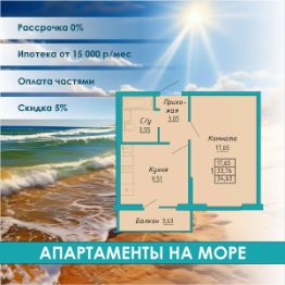 Продаются 1-комнатные апартаменты в строящемся доме (Строение 1), срок сдачи: I-кв. 2026, общей площадью 34.63 кв.м., на 7 этаже. "Бирюзовая бухта" - трехсекционный восьмиэтажный апартаментный комплекс с развитой инфраструктурой, расположенный в экологически чистом районе города, в 15-ти минутах ходьбы до благоустроенной набережной и оборудованного, бесплатного песчаного пляжа.