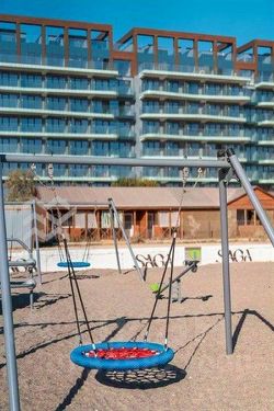 Широкий песчано-галечный пляж расположен в 150 метрах от комплекса. Именно качество песка позволило западному побережью Крыма стать, пожалуй, самым известным из отечественных песчаных курортов. Мелкий золотистый песок пляжа идеально подходит не только для отдыха, но и для проведения лечебных процедур. Благодаря комфортному и пологому входу в море, безопасному песчаному дну с мелкой галькой пляж идеален для детей.