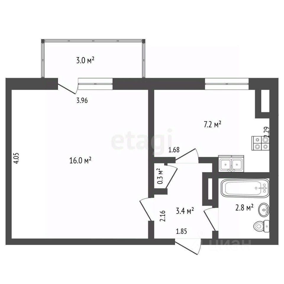Квартира общей площадью 29,7 м² включает в себя светлую комнату с кондиционером, диваном и шкафом для хранения, а также кухню 7.2 м², оснащённую необходимой техникой — холодильником и газовой плитой. Совмещённый санузел оборудован современной душевой кабиной. Балкон площадью 3,0 м² добавляет дополнительное пространство для отдыха. Жилая комната 16.0 м², прихожая 3.4 м², а совмещённый санузел 2.8 м².