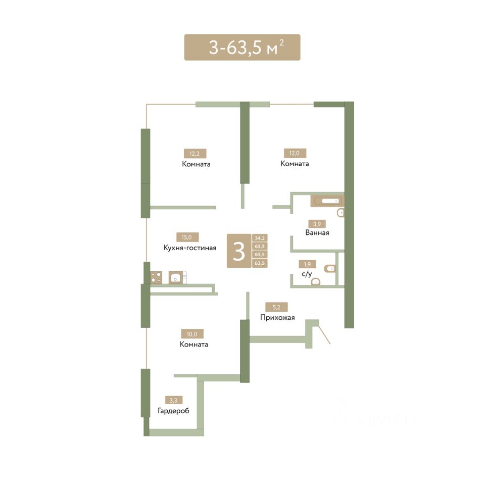 Продаётся 3-комнатная квартира в строящемся доме (Дом 6к1), срок сдачи: II-кв. 2026, общей площадью 63.5 кв.м., на 1 этаже. УМНЫЙ ЖИЛОЙ КОМПЛЕКС