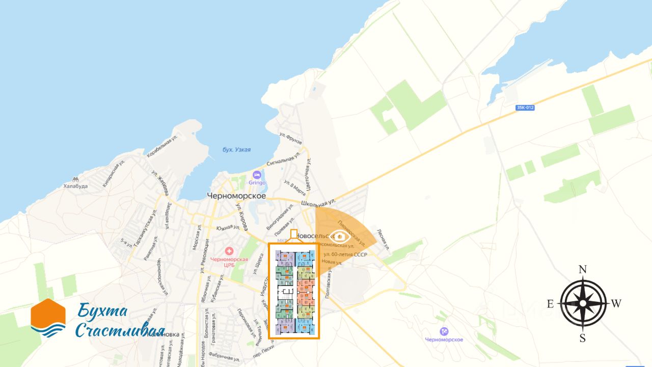 "Бухта счастливая" расположена в курортном поселке Черноморское, вся береговая линия района изрезана уютными бухтами, благодаря чему здесь самое богатое разнообразие пляжей в Крыму. Песчаные участки чередуются со скалистым побережьем, с гротами и плато. Именно в Черноморском районе расположены Мыс Тарханкут, Крымские Мальдивы, и многие другие. Западное побережье Крыма — новая точка притяжения. Здесь цены только начинают догонять Ялту и Сочи, что дает инвесторам преимущество, а жильцам - выбрать большую площадь, не переплачивая.