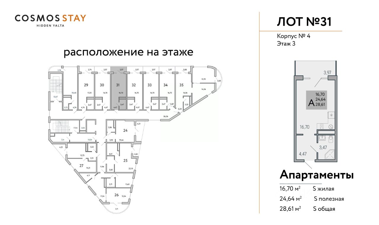 Квадратура апартаментов: от 25м2 до 80,4 м2.