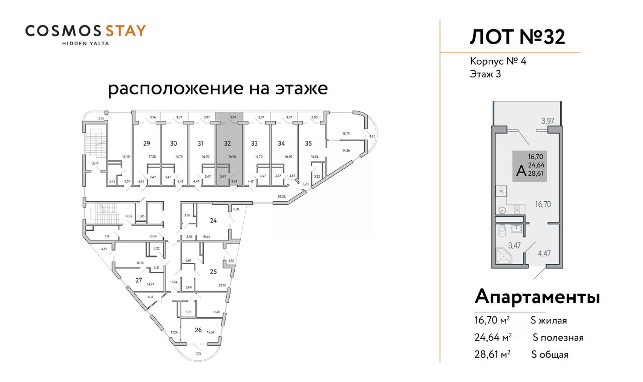 Квадратура апартаментов: от 25м2 до 80,4 м2.