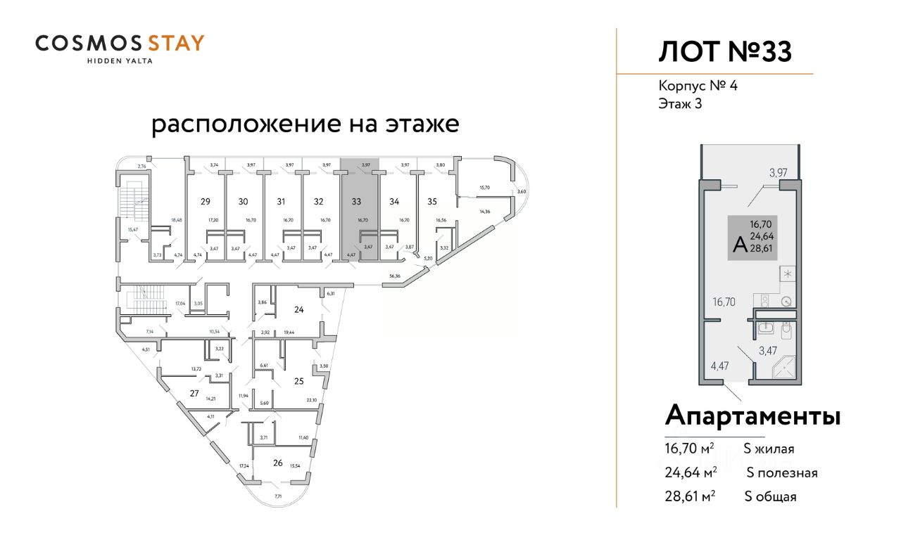 Квадратура апартаментов: от 25м2 до 80,4 м2.