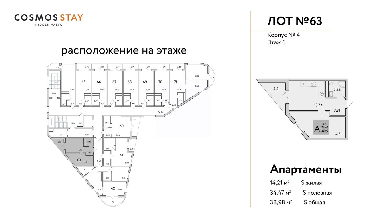 Квадратура апартаментов: от 25м2 до 80,4 м2.
