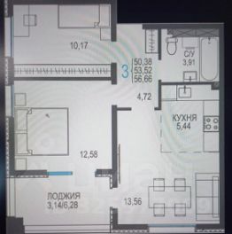 Квартира 56 м2, кухня гостиная 19 м2, две спальни 10 и 12 м2, застекленная панорамная лоджия 6 м2.