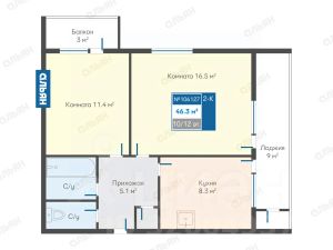 Кухня 8,3 м2, санузел 4,4 м2, комната 11,4 м2, комната 16,5 м2, лоджия 9 м2, балкон 3 м2 прохожая 5,1 м2.