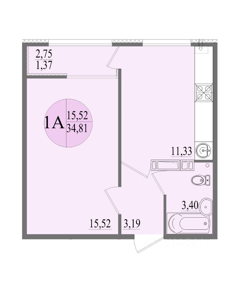 Общая площадь34,81 м²