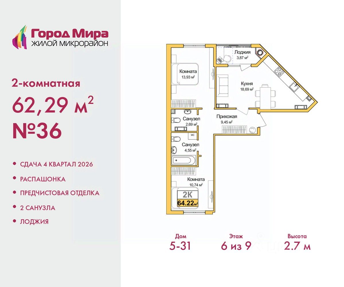 Продается 2-комн. квартира с предчистовой отделкой в ЖМ "Город Мира" на 6 этаже. Общая площадь: 62.29 кв.м., жилая: 24.67 кв.м., площадь просторной кухни-столовой: 18.69 кв.м. Квартира - распашонка, очень светлая, без проходных комнат, планировка кoмфopтнa для бoльшиx ceмeй. В квартире одна лоджия, один совмещенный и один раздельный санузел. Высота потолков 2.7 м.