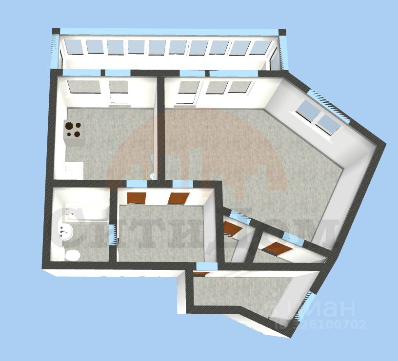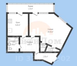 Состоит из просторной комнаты 20.1 кв.м., кухни 8.2 кв.м., совмещенного санузла, прихожей, лоджии (выход из комнаты и кухни) и двух кладовок.