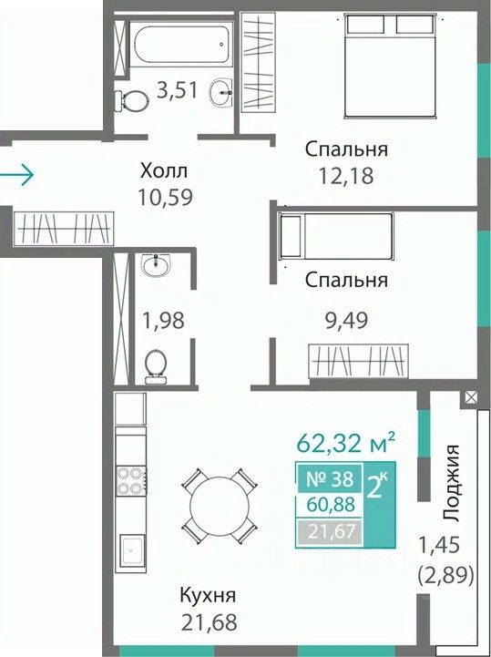 Продаётся 2-комнатная квартира в строящемся доме (Дом 2 (Секции Т2.1, Т2, К3КП1)), срок сдачи: I-кв. 2029, общей площадью 60.88 кв.м., на 6 этаже. Новый жилой комплекс "Благо" от застройщика "Монолит" расположен по адресу: Республика Крым, Симферопольский район, село Перово