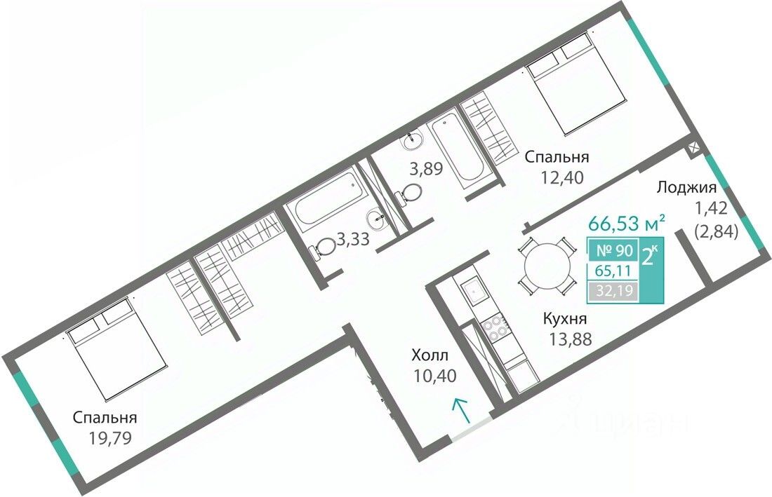 Продаётся 2-комнатная квартира в строящемся доме (Дом 1 (Секции Т2.2, Т4.1)), срок сдачи: I-кв. 2029, общей площадью 65.11 кв.м., на 3 этаже. Новый жилой комплекс "Благо" от застройщика "Монолит" расположен по адресу: Республика Крым, Симферопольский район, село Перово