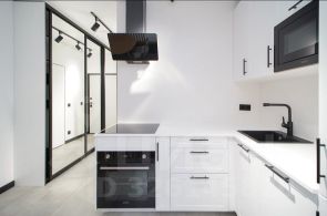 Вся необходимая мебель (кровать, шкафы, мягкая зона, кухонный гарнитур) и бытовая техника (кондиционер, холодильник, плита, СВЧ, телевизор, стиральная машина) — новое, отличного качества.