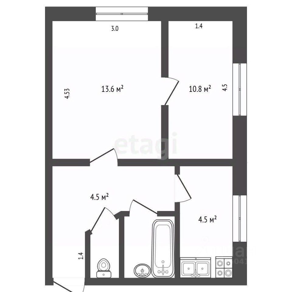 Планировка практичная: две смежные комнаты общей жилой площадью 25 кв. м., раздельный санузел и кухня в 5 кв. м. с высотой потолков 2,5 метра.