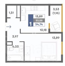 В продаже 1-но комнатная квартира, которая состоит из кухни 10,2 м2, комнаты 13,9 м2, совмещенного санузла 4,0 м2, прихожей 4,0 м2, гардеробной 1,5 м2 и балкона. Общая площадь 34,7 м2.
