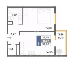 В продаже 1-но комнатная квартира, которая состоит из кухни-гостиной 14,9 м2, комнаты 13,9 м2, совмещенного санузла 4,0 м2, прихожей 4,0 м2, гардеробной 1,5 м2 и балкона. Общая площадь 39,4 м2.