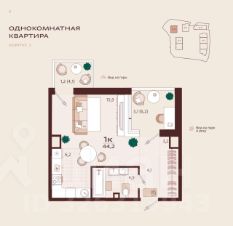 Общая площадь — 44,2 кв.м. Балкон — 4,1 кв.м.
