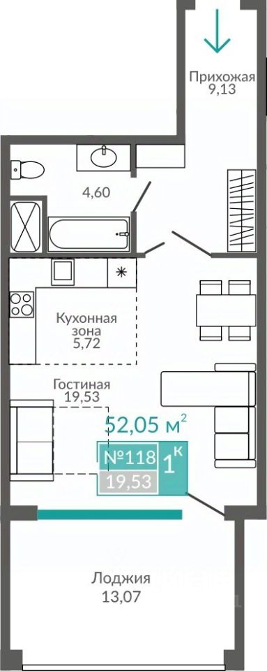 Общая площадь52,05 м²