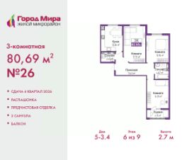 3-комн. квартира от застройщика с предчистовой отделкой в ЖМ "Город Мира" на 6 этаже. Общая площадь: 80.69 кв.м., жилая: 45.88 кв.м., площадь просторной кухни-столовой: 12.04 кв.м. Квартира - распашонка, без проходных комнат, окна выходят на paзные стороны дома. В квартире один балкон, один совмещенный и один раздельный санузел. Высота потолков 2.7 м.