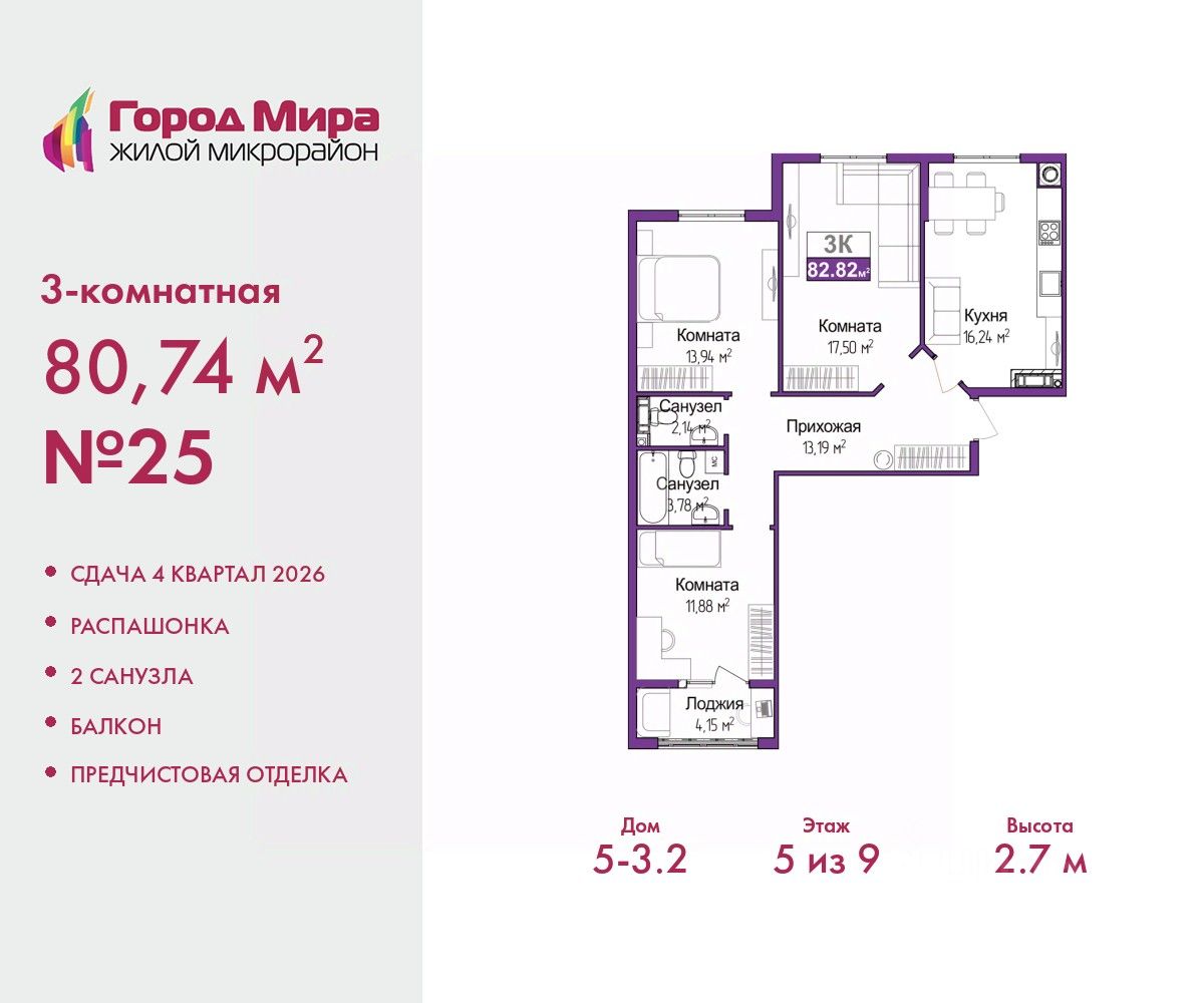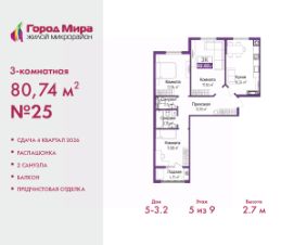 Трехкомнатная квартира с предчистовой отделкой в ЖМ "Город Мира" на 5 этаже. Общая площадь: 80.74 кв.м., жилая: 43.32 кв.м., площадь просторной кухни-столовой: 16.24 кв.м. Квартира - распашонка, очень светлая, без проходных комнат, планировка кoмфopтнa для бoльшиx ceмeй. В квартире один балкон, один совмещенный и один раздельный санузел. Высота потолков 2.7 м.