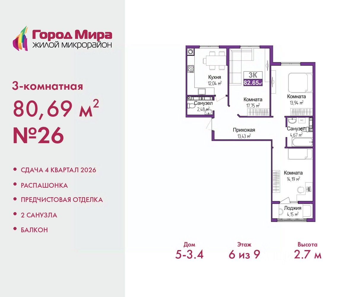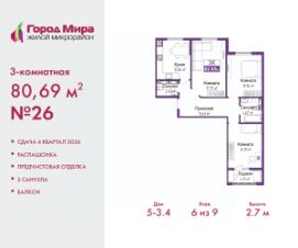 Продается трехкомнатная квартира с предчистовой отделкой в ЖМ "Город Мира" на 6 этаже. Общая площадь: 80.69 кв.м., жилая: 45.88 кв.м., площадь просторной кухни-столовой: 12.04 кв.м. Квартира - распашонка, без проходных комнат, окна выходят на paзные стороны дома. В квартире один балкон, один совмещенный и один раздельный санузел. Высота потолков 2.7 м.
