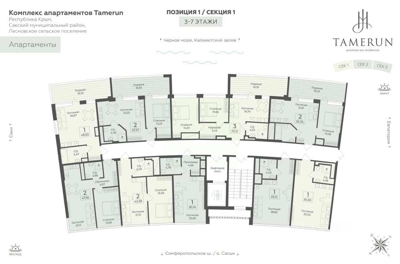 Продаются 1-комнатные апартаменты в строящемся доме (Этап 1 (Секции 1-3)), срок сдачи: IV-кв. 2028, общей площадью 42.98 кв.м., на 6 этаже. "Tamerun" - морская резиденция на Западном берегу Крыма, между городами Евпатория и Саки.