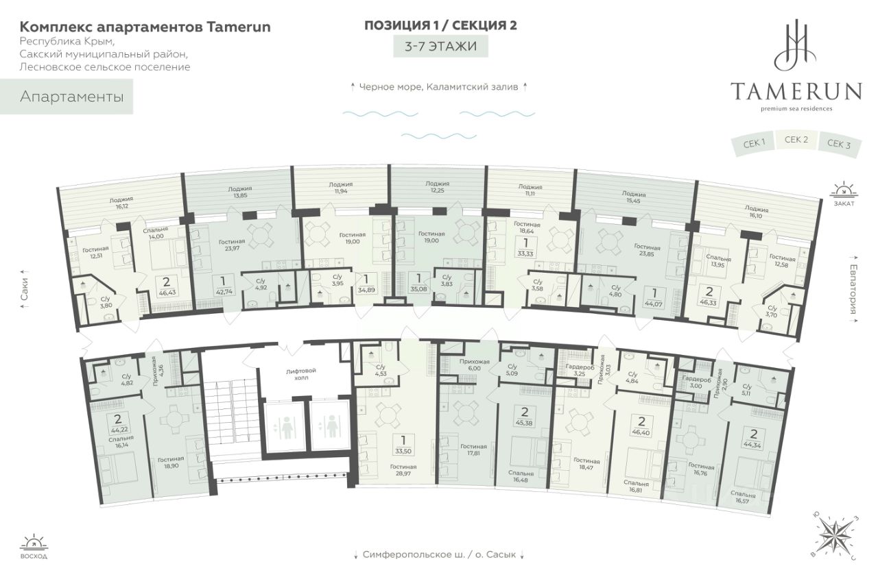 Продаются 1-комнатные апартаменты в строящемся доме (Этап 1 (Секции 1-3)), срок сдачи: IV-кв. 2028, общей площадью 45.38 кв.м., на 5 этаже. "Tamerun" - морская резиденция на Западном берегу Крыма, между городами Евпатория и Саки.