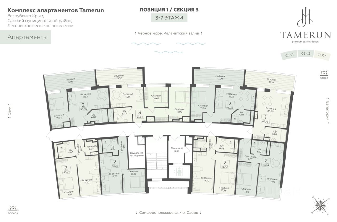 Продаются 2-комнатные апартаменты в строящемся доме (Этап 1 (Секции 1-3)), срок сдачи: IV-кв. 2028, общей площадью 47.54 кв.м., на 6 этаже. "Tamerun" - морская резиденция на Западном берегу Крыма, между городами Евпатория и Саки.