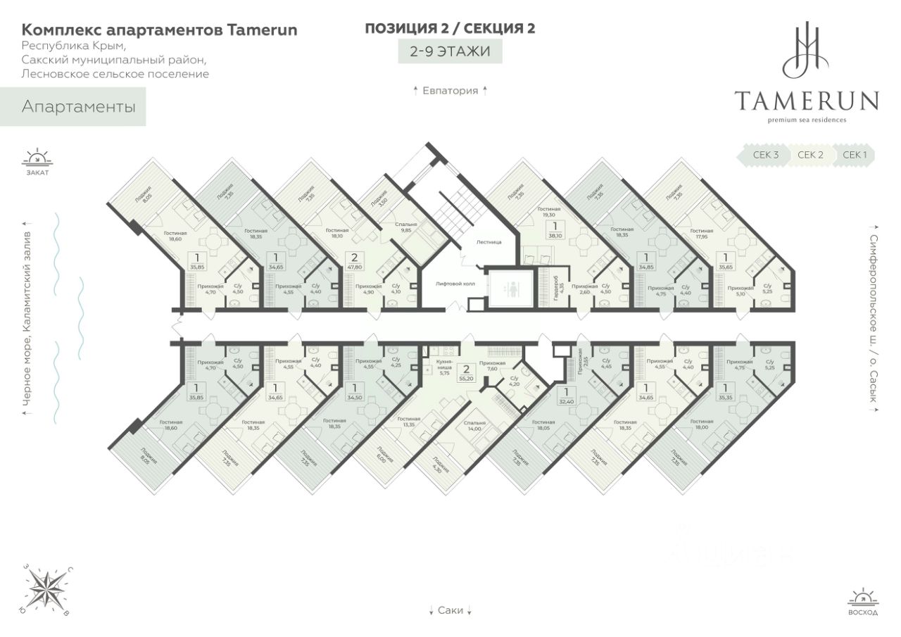 Продаётся студия-апартаменты в строящемся доме (Этап 2 (Секции 1-3)), срок сдачи: II-кв. 2029, общей площадью 35.65 кв.м., на 4 этаже. "Tamerun" - морская резиденция на Западном берегу Крыма, между городами Евпатория и Саки.