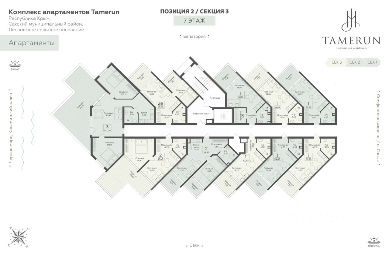 Продаются 2-комнатные апартаменты в строящемся доме (Этап 2 (Секции 1-3)), срок сдачи: II-кв. 2029, общей площадью 47.65 кв.м., на 7 этаже. "Tamerun" - морская резиденция на Западном берегу Крыма, между городами Евпатория и Саки.