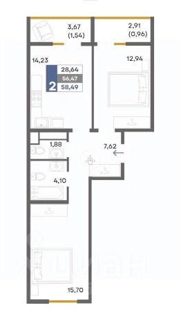В продаже 2-х комнатная квартира, которая состоит из кухни-гостиной 14,2 м2, комнат 15,7 и 13,0 м2, санузла 4,1 и 1,9 м2, прихожей 7,6 м2 и 2 балконов. Общая площадь 58,5 м2.