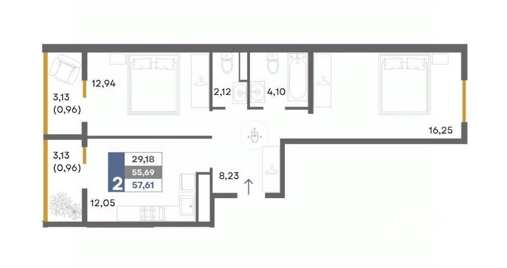 В продаже 2-х комнатная квартира, которая состоит из кухни-гостиной 12,1 м2, комнат 16,3 и 12,9 м2, санузла 4,1 и 2,1 м2, прихожей 8,2 м2 и 2 балконов. Общая площадь 57,6 м2.