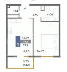 В продаже 1-но комнатная квартира, которая состоит из кухни-гостиной 14,9 м2, комнаты 13,9 м2, совмещенного санузла 4,0 м2, прихожей 4,0 м2, гардеробной 1,5 м2 и балкона. Общая площадь 39,4 м2.