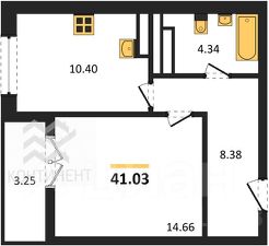 Комната 14,66 м.кв.,кухня 10,4 м.кв., сан.узел 4,34 м.кв и лоджия 3,25 м.кв.