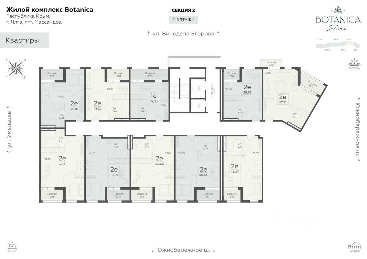 Продаётся 2-комнатная квартира в строящемся доме (Корпус 1 (секция 1, 2)), срок сдачи: I-кв. 2029, общей площадью 53.91 кв.м., на 2 этаже. Новый жилой комплекс "Botanica" от застройщика "Развитие" расположен по адресу Россия, Республика Крым, городской округ Ялта, посёлок городского типа Массандра, Южнобережное шоссе