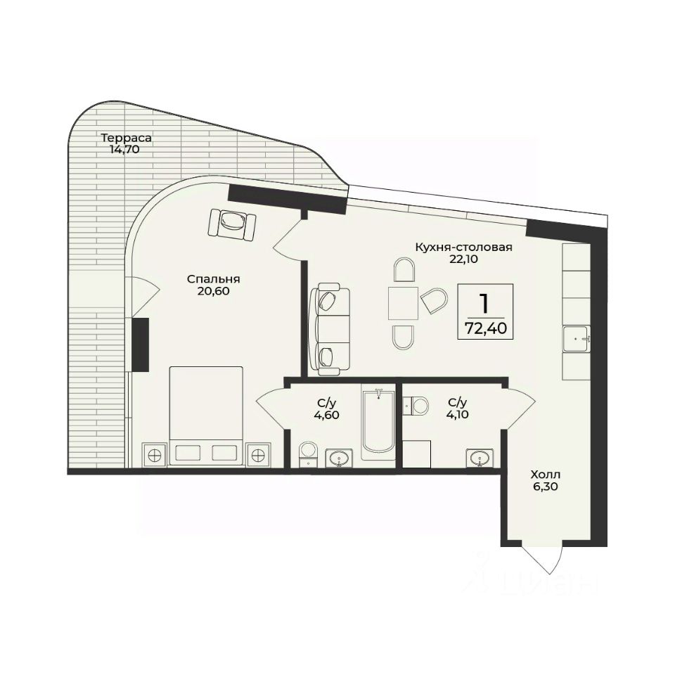 Продаётся 2-комнатная квартира в строящемся доме (Корпус 3), срок сдачи: III-кв. 2028, общей площадью 72.4 кв.м., на 5 этаже. Премиальный жилой комплекс "Нега" возводится в Профессорском уголке неподалёку от набережной, где снимался фильм "Кавказская пленница".