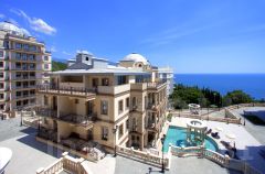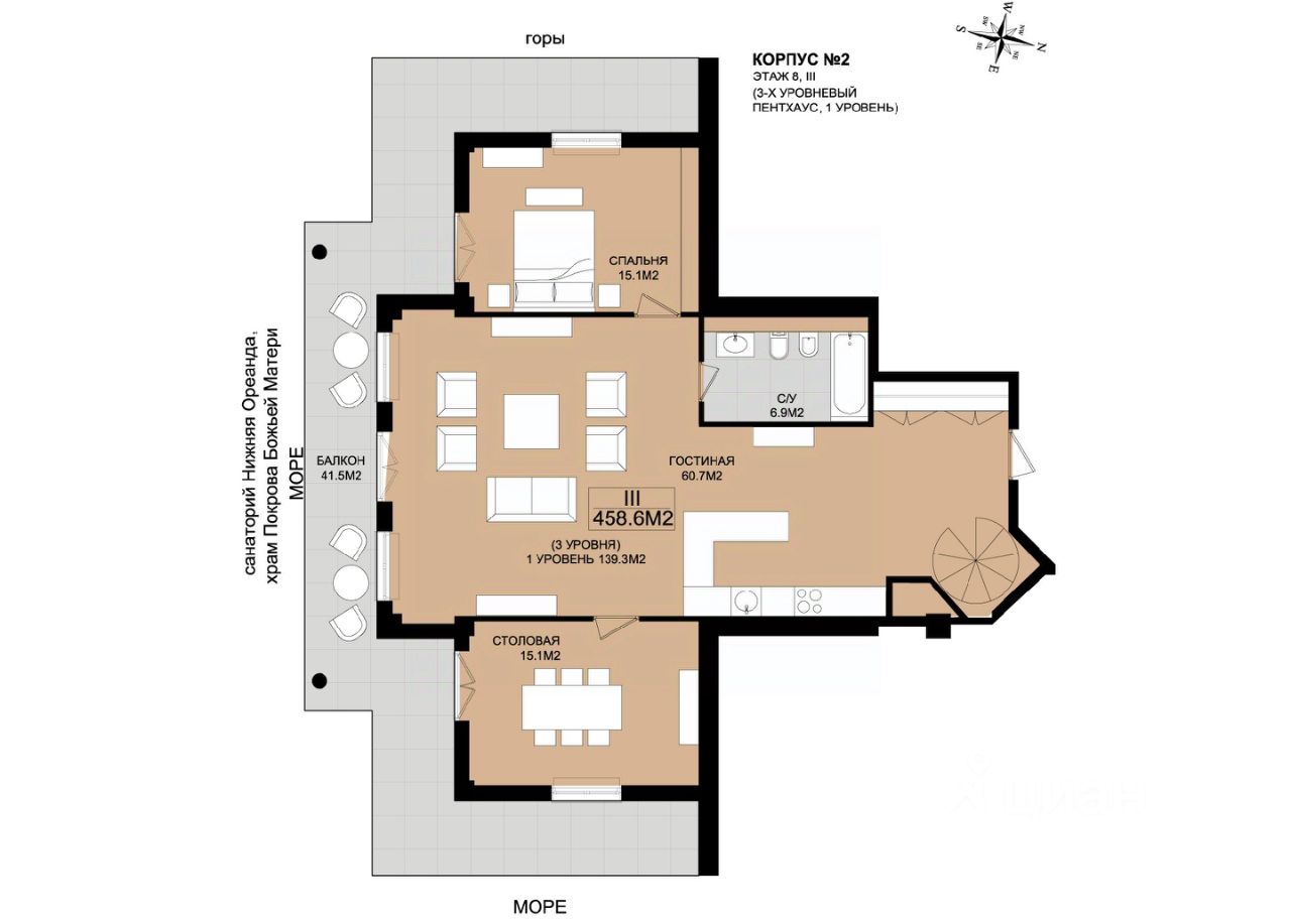 Роскошный 3-уровневый пентхаус без отделки в премиальном комплексе Дипломат, корпус 2. Панорамный вид на море, горы, Ореанду, Храм. Построен, сдан. Собственность, оформление по ДКП. Цена не окончательная, подлежит обсуждению. На территории 3 открытых бассейна, ресторан, собственный СПА-центр с крытым бассейном, сауна, русская баня, хамам, тренажерный зал. До пляжа 500 метров по закрытой охраняемой территории соседнего санатория.