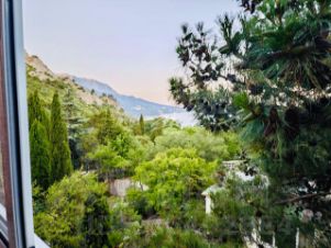 — Двор в хвойных деревьях и можжевельнике — воздух чистый, пахнет морем и Крымом. Окна открыты — шума нет.