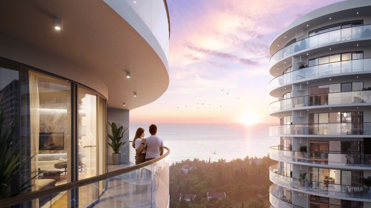 Здания оригинальной треугольной формы обеспечивают равномерное наполнение каждых апартаментов солнечным светом. Точно выверенный угол поворота корпусов позволяет любоваться завораживающими панорамами Крыма.