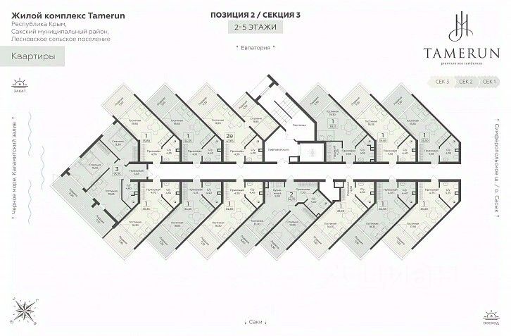 Резиденция "Tamerun" представляет собой современный комплекс из четырёх корпусов высотой 9 и 12 этажей, гармонично вписанных в живописный ландшафт. Интерьеры выполнены в изысканном элегантном стиле с применением премиальных материалов — натурального мрамора, ценных пород дерева и высококачественной кожи. Просторные помещения наполнены естественным светом благодаря большим панорамным окнам, открывающим завораживающие виды на Черное море. Атмосфера резиденции пропитана уютом и гармонией, создавая идеальные условия для комфортной жизни и отдыха.