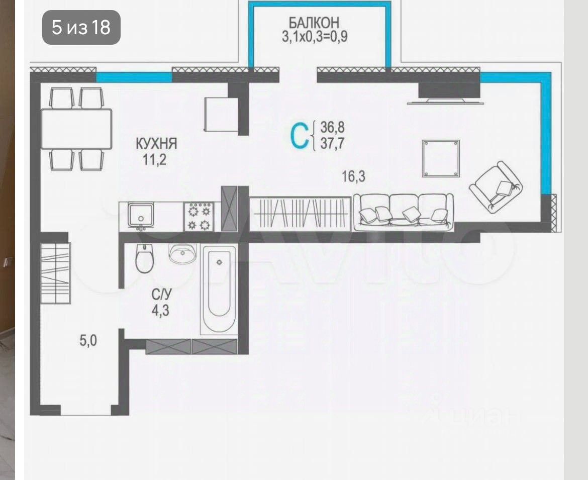• Гостиная, совмещенная со спальной зоной, с выходом на балкон