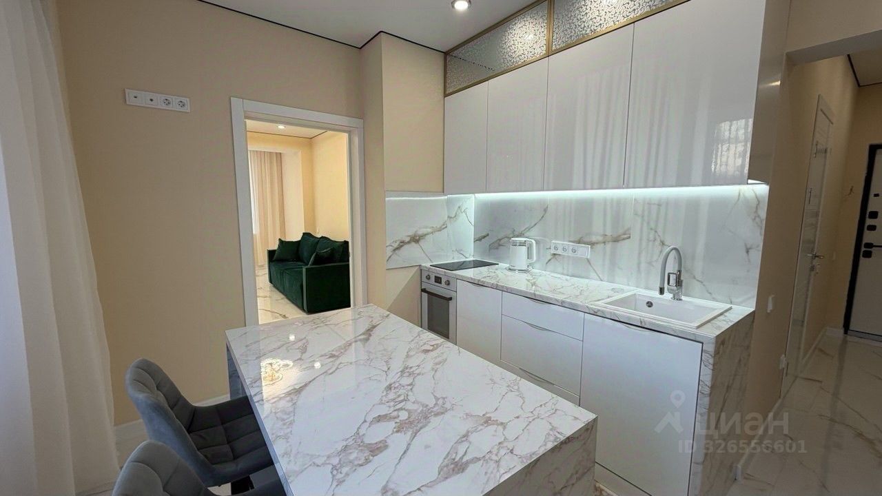 Квартира оформлена в современном стиле с использованием светлых тонов и ярких акцентов. Пространство обустроено качественной мебелью и современной техникой, а кухня готова к использованию с первых дней.