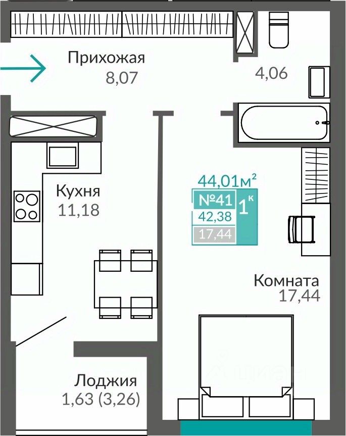 Продаётся 1-комнатная квартира в строящемся доме (С7), срок сдачи: III-кв. 2027, общей площадью 42.38 кв.м., на 6 этаже. Жилой квартал "Абрикос" - начало яркой истории жизни в прогрессивном районе Симферополя - Семья городских кварталов "Крымская Роза".